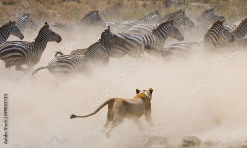 Wall mural lioness sre attacking on a zebra. national park. kenya. tanzania. masai mara. serengeti.