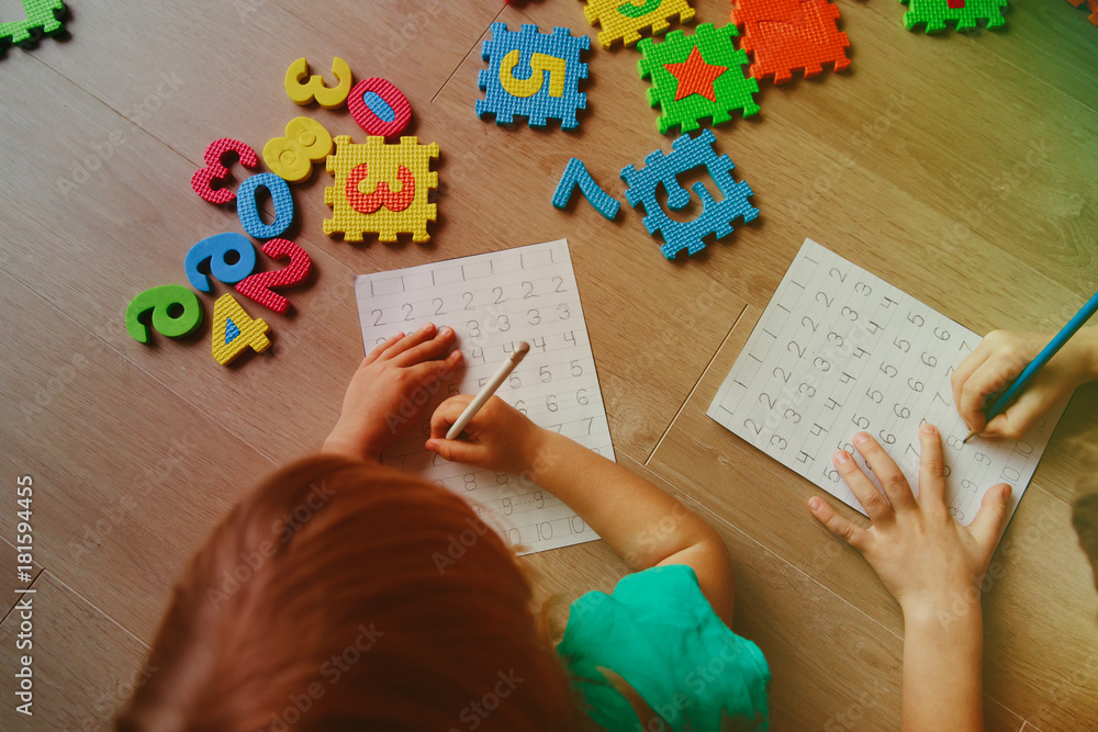The watermark will not be included on Wall mural.: Little boy and girl learn to write and calculate numbers