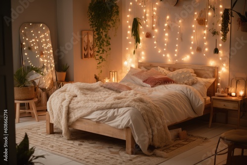The watermark will not be included on Wall mural.: Living room decorated with strings of fairy lights, created using generative ai technology