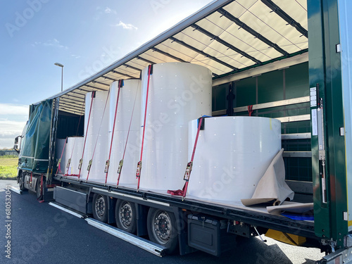 The watermark will not be included on Wall mural.: Loading, transporting and unloading large rolls of paper in a semi-trailer - securing cargo with stra