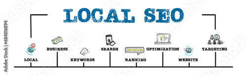 Wall mural local seo concept. illustration with keywords and icons. horizontal web banner