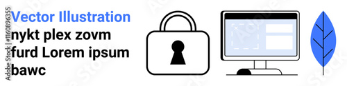Lock symbolizing security next to computer monitor displaying a screen with text and a blue leaf to Wall mural