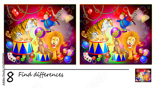 Wall mural logic puzzle game for children. need to find 8 differences. circus performance with animals. printab