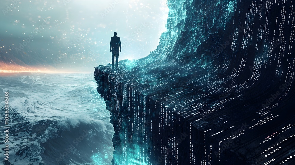 Wall mural : Lone hacker decodes glowing digital ocean waves of binary code on cliff edge