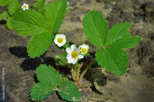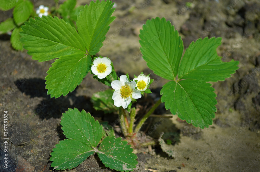 The watermark will not be included on Wall mural.: Lonely strawberry bush with three flowers in garden