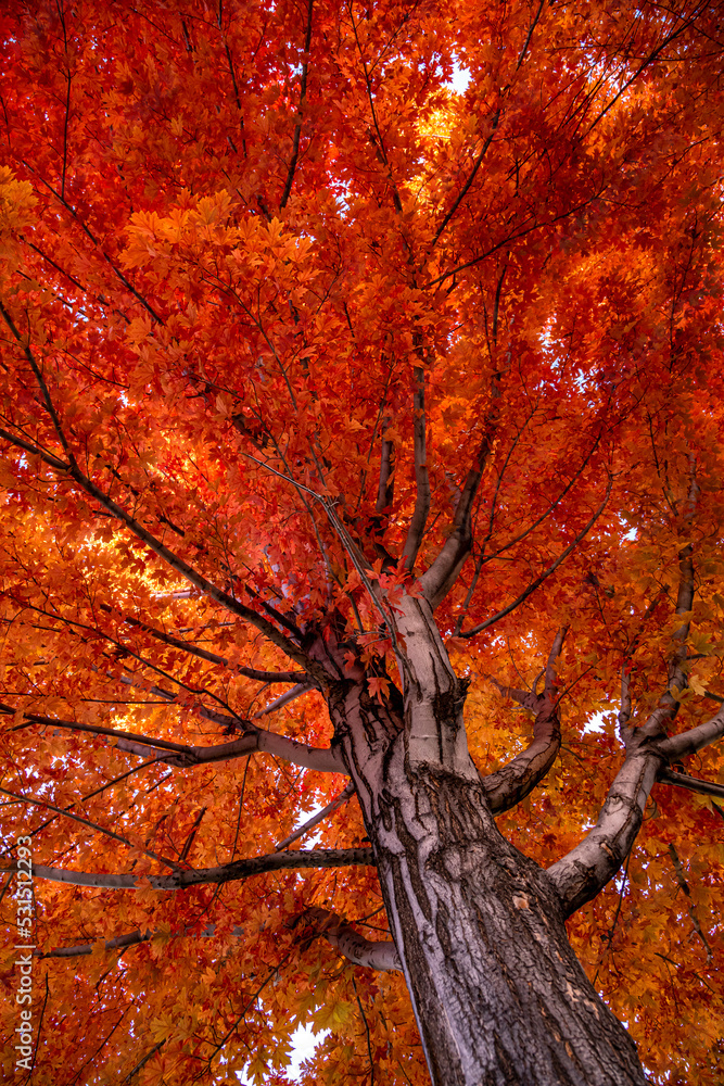 The watermark will not be included on Wall mural.: Looking up the trunk of a red maple tree in full fall color