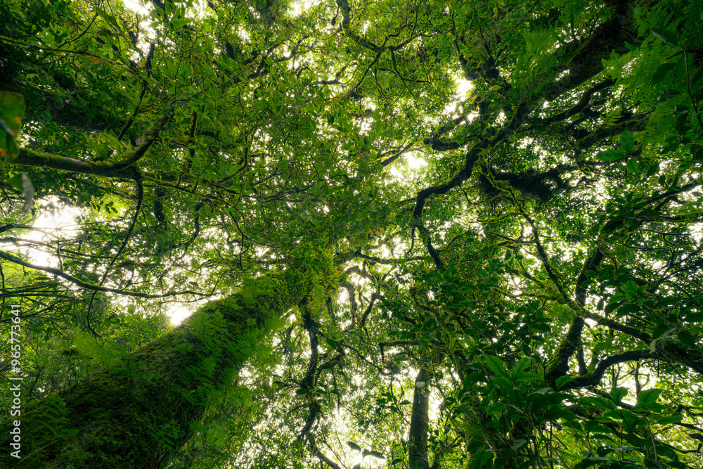 Wall mural looking up view of tree trunk to green leaves of tree in forest with sun light. fresh environment in