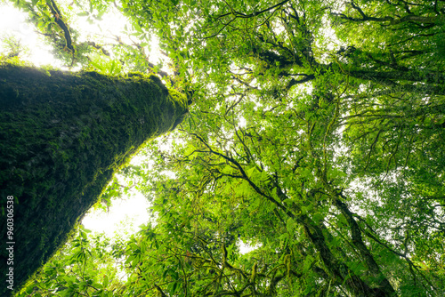 Wall mural : Looking up view of tree trunk to green leaves of tree in forest with sun light - fresh environment in