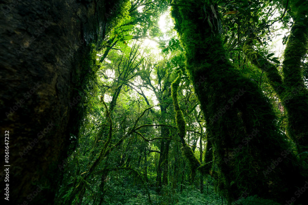 The watermark will not be included on Wall mural.: Looking up view of tree trunk to green leaves of tree in forest with sun light - fresh environment in