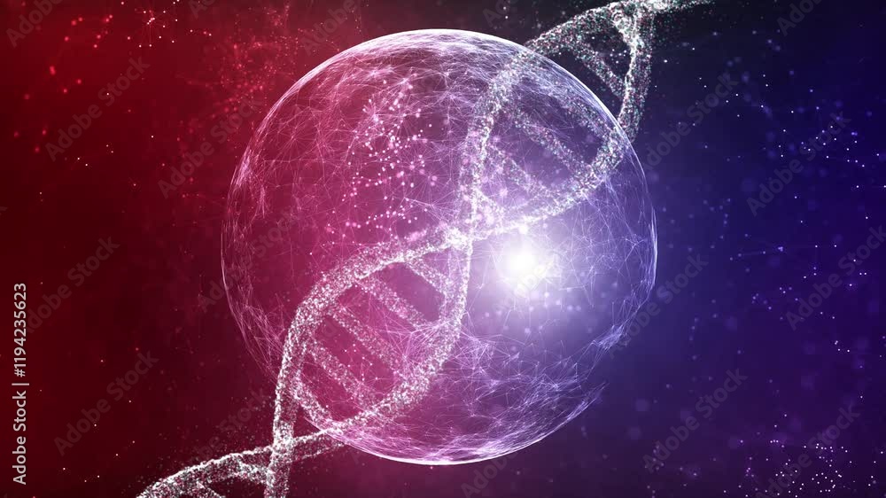 Wall mural : Loop 3d dna chain and digital sphere rotation on colourful digital background -