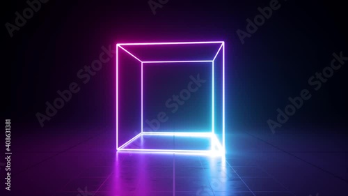 Wall mural loop animation of virtual neon light glowing cube spins and rotates, changes colors