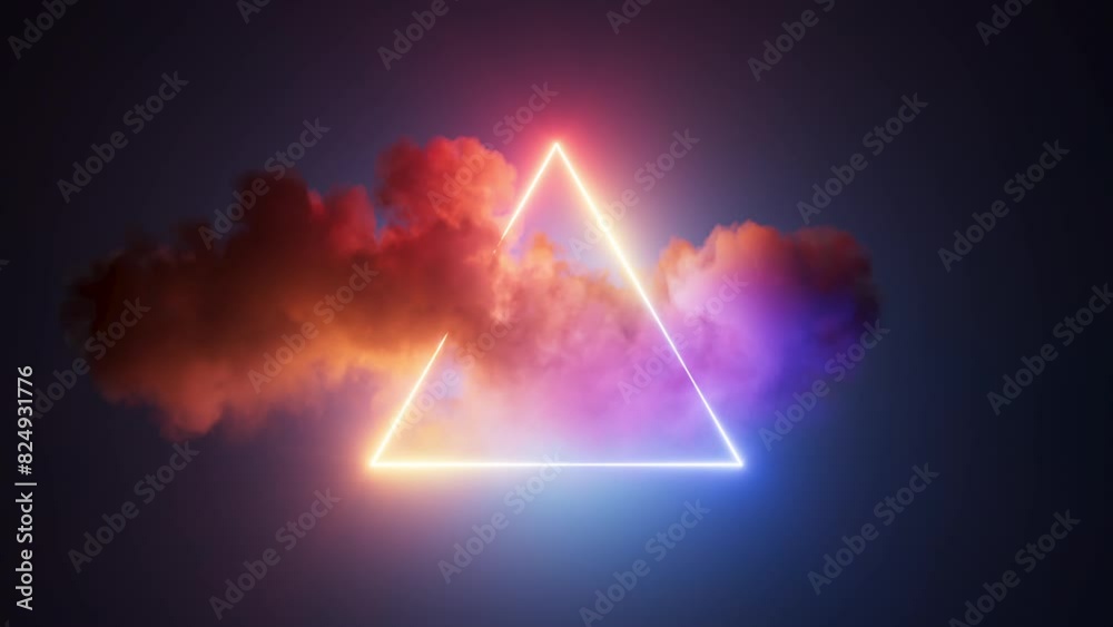 The watermark will not be included on Wall mural.: Looping 3d animation, abstract neon background - colorful cloud spins around the glowing triangle - fa