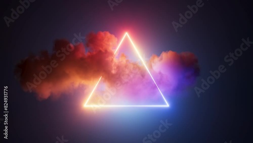 Wall mural looping 3d animation, abstract neon background. colorful cloud spins around the glowing triangle. fa