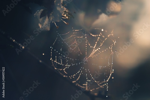 Wall mural lovely background with cobwebs in the sun. drops of water on the cobweb.
