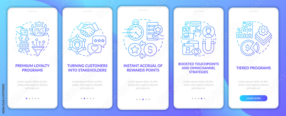 Wall mural : Loyalty program tendencies blue gradient onboarding mobile app page screen - walkthrough 5 steps grap