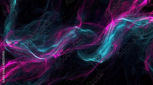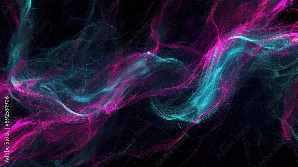 The watermark will not be included on Wall mural.: Luminous threads of magenta and cyan creating a dynamic abstract pattern on a black backdrop, text-f