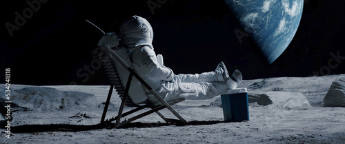 Wall mural lunar astronaut chilling on a beach chair with refrigerator bag on moon surface, enjoying view of ea - Wall murals Wall mural lunar astronaut chilling on a beach chair with refrigerator bag on moon surface, enjoying view of ea - Wall murals