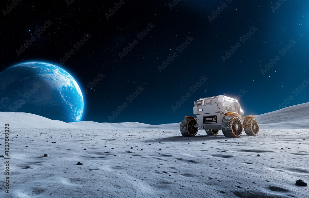 The watermark will not be included on Wall mural.: Lunar exploration vehicle traverses the surface of the moon with earth visible in the background