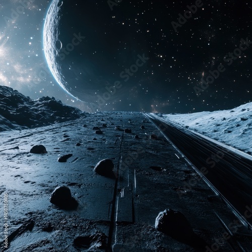 Wall mural : Lunar surface exploration with a distant planet and starry sky in a science fiction setting and dark