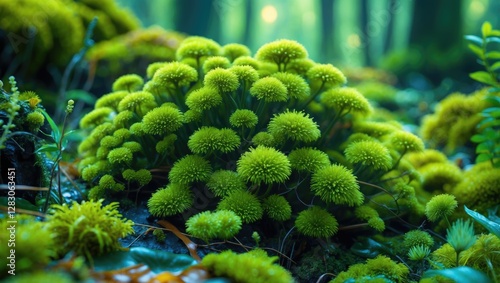 Lush green moss clumps in a forest environment with soft sunlight filtering through trees creating aWall mural