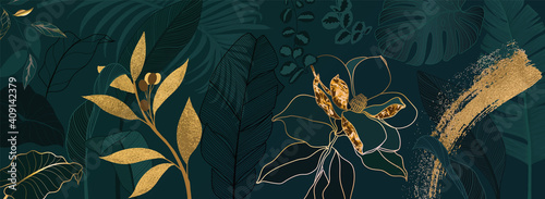 Wall mural : Luxury green summer background and wallpaper vector with golden metallic decorate wall art