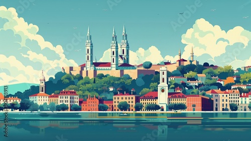 Wall mural : Lyon landmarks, basilica of notre dame de fourviere and place bellecour, france, minimal flat design