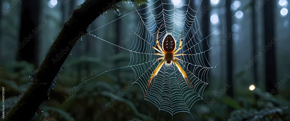 Wall mural macro focus on glistening spider with intricate patterns clinging to dew adorned web strands in fore