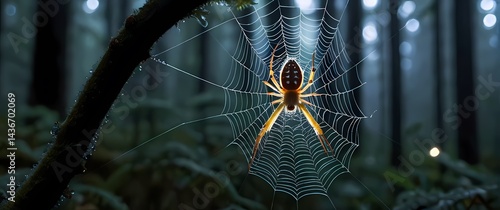 Wall mural : Macro focus on glistening spider with intricate patterns clinging to dew adorned web strands in fore