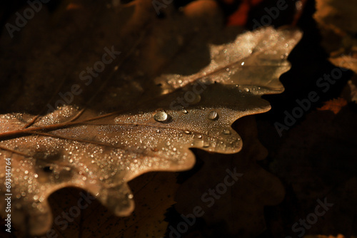 Wall mural macro image of an oak tree leaf with raindrops - Wall murals Wall mural macro image of an oak tree leaf with raindrops - Wall murals