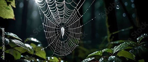 The watermark will not be included on Wall mural.: Macro image of intricate spider web droplets sparkling like diamonds against dark leafy forest backg