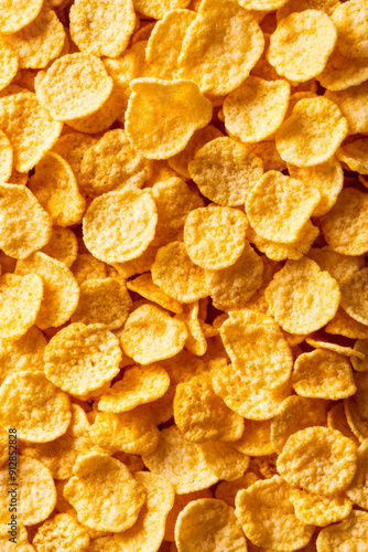 Wall mural macro shot of the texture of cornflakes showcasing the golden crispy flakes with intricate patterns
