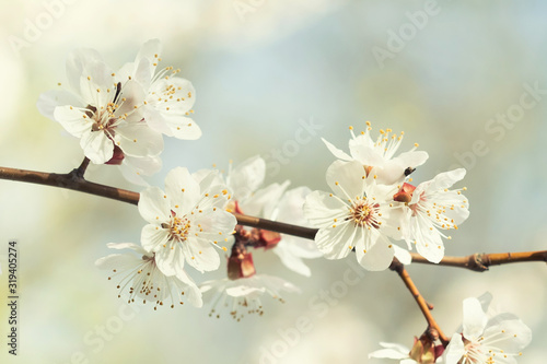 Wall mural : Macro view blooming sakura tree branch - beautiful branch of a fruit tree with blossom flowers white