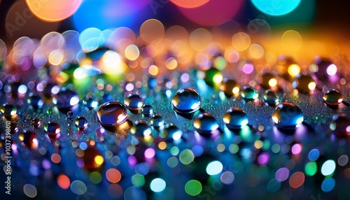 The watermark will not be included on Wall mural.: Macro view of water droplets with multicolored bokeh lights