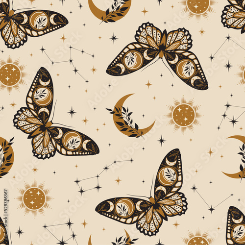 Wall mural magic celestial seamless pattern with constellations. boho magic background with space elements star