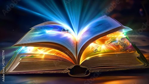 Wall mural : Magic open book with glowing pages and sparkling particles 4k animation - seamless looping video back