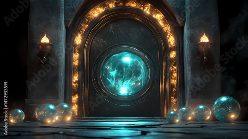 The watermark will not be included on Wall mural.: Magical relic vault glowing orbs 3d render scene video game concept background illustration digital