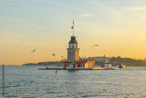 Wall mural maiden's tower aka kiz kulesi view at sunset. visit istanbul background