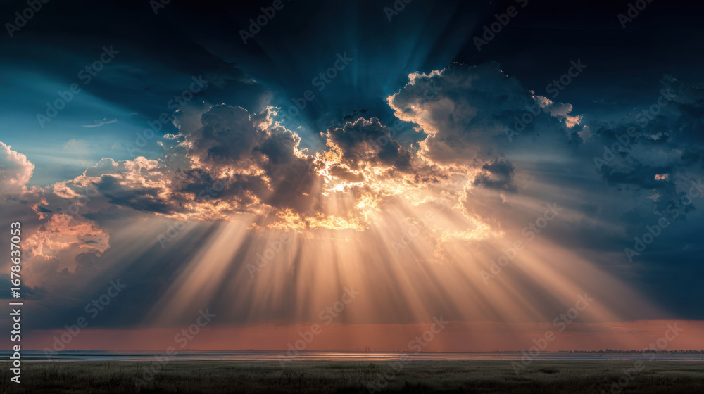 Wall mural majestic clouds illuminated by sunlight create stunning display in sky, casting rays of light over s - Wall murals Wall mural majestic clouds illuminated by sunlight create stunning display in sky, casting rays of light over s - Wall murals