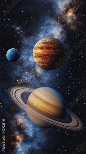 The watermark will not be included on Wall mural.: Majestic planetary alignment in deep space with vibrant nebulae and cosmic dust creating a celestial