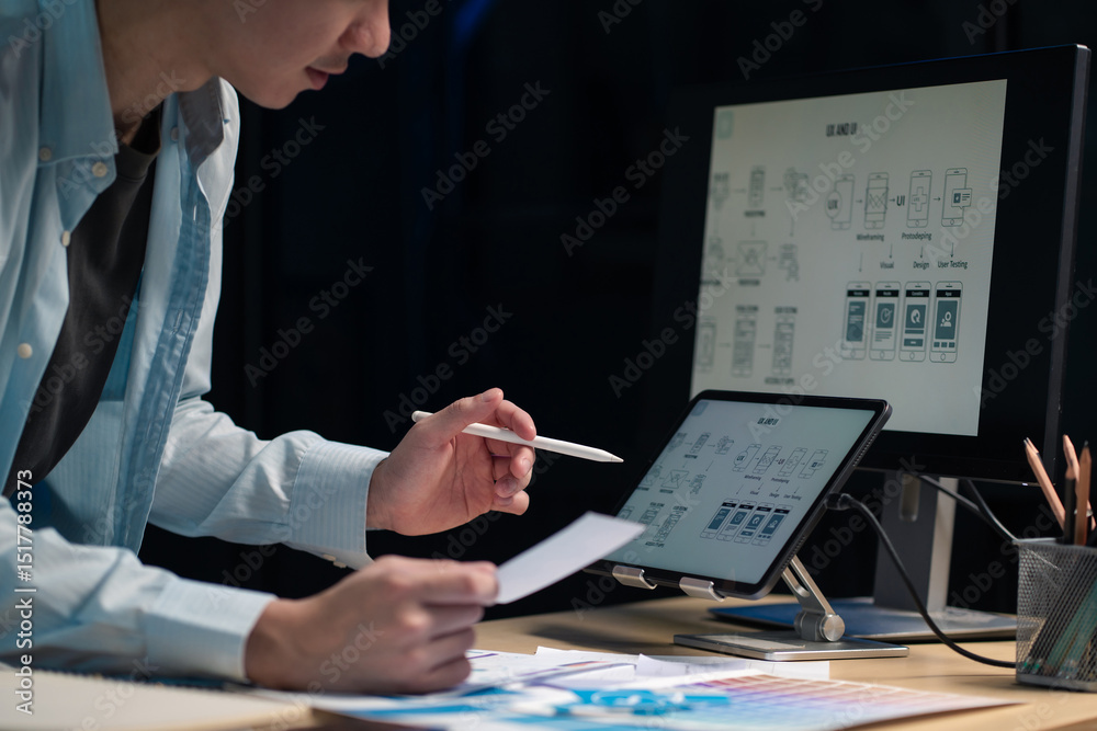 The watermark will not be included on Wall mural.: Male coder or developer working overtime using a computer display in problem solving at workplace -
