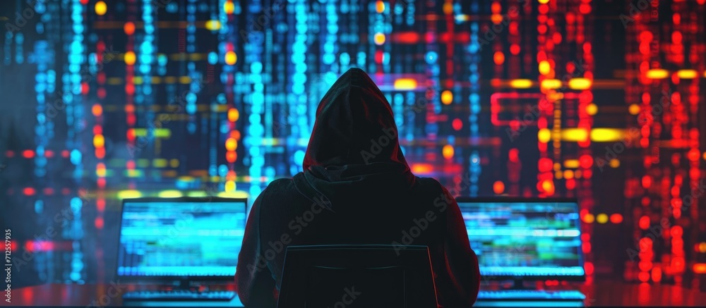 Wall mural male hacker performing cyberattack on government system, attempting theft of crucial information and - Wall murals Wall mural male hacker performing cyberattack on government system, attempting theft of crucial information and - Wall murals