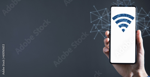 Wall mural male hand showing wireless technology symbol. wifi symbol with a network connection - Wall murals Wall mural male hand showing wireless technology symbol. wifi symbol with a network connection - Wall murals