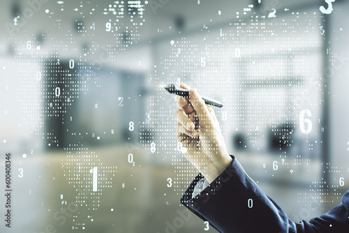 Wall mural male hand with pen working with abstract virtual coding illustration and world map on blurred office