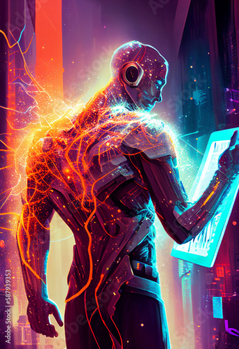 The watermark will not be included on Wall mural.: Male humanoid robot technician programmer facing a virtual internet environment with big data and ar