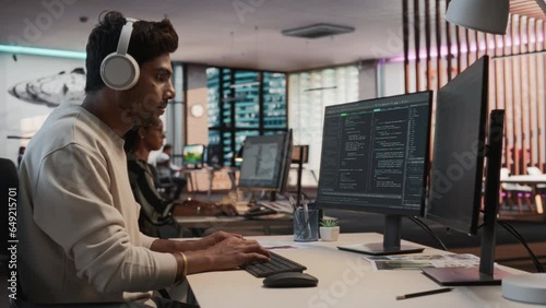 Wall mural male indian game programmer coding on desktop computer in game design studio diverse office. focused - Wall murals Wall mural male indian game programmer coding on desktop computer in game design studio diverse office. focused - Wall murals
