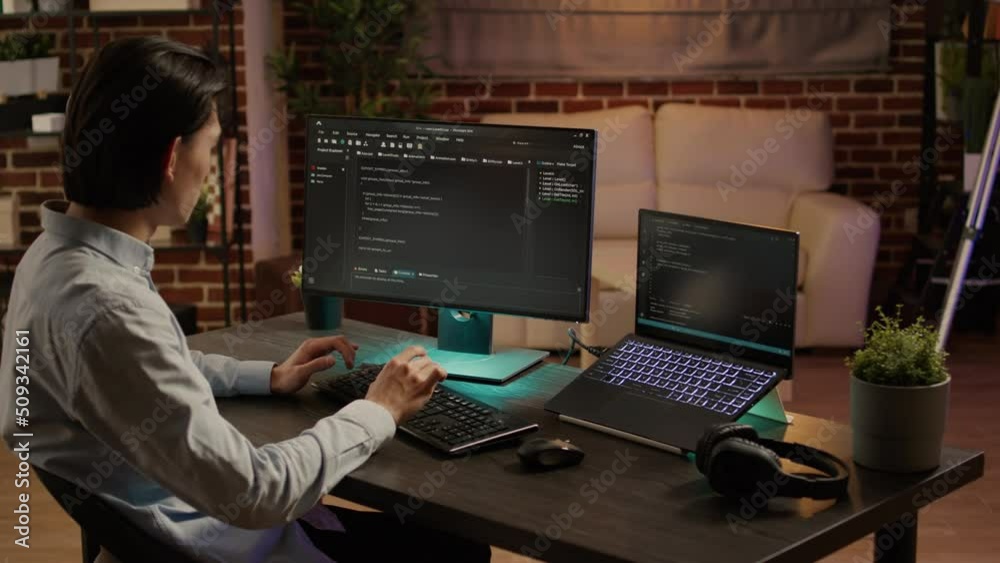 The watermark will not be included on Wall mural.: Male system hacker coding security program on pc software, programming firewall data on encryption s