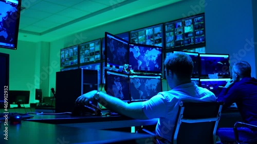 The watermark will not be included on Wall mural.: Male workers sitting near computers on monitoring room and working - programmers or engineers using