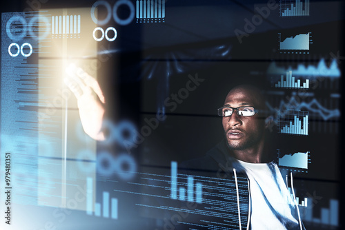 The watermark will not be included on Wall mural.: Man, glasses and programmer at night with hologram, selection and dashboard for web design - person,