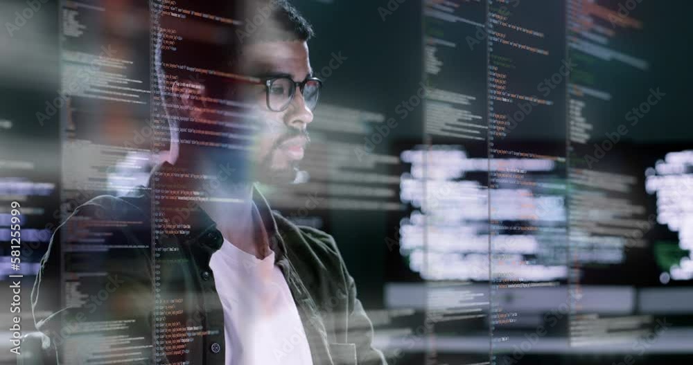 Man, programming and coding at night on computer dashboard for software or application at the officeWall mural
