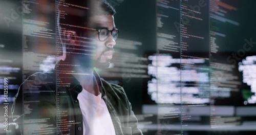 The watermark will not be included on Wall mural.: Man, programming and coding at night on computer dashboard for software or application at the office